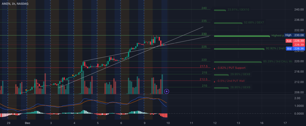* Opening Movement: AMZN opened with bullish momentum, continuing its trend from the previous session. It tested the $230 resistance level, coinciding with the Highest Positive GEX and psychological significance.