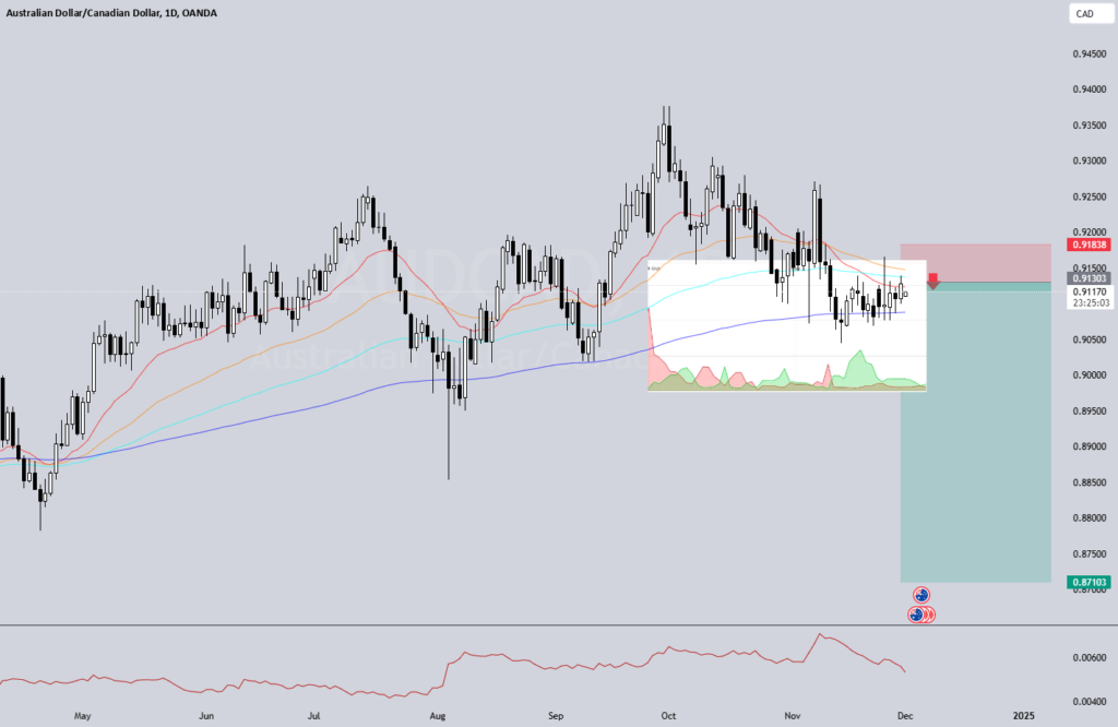 AUD/CAD faces mounting downside pressure, as both technical and fundamental signals align against bullish sentiment. Large speculators appear increasingly disinterested in driving meaningful upside, as reflected in lackluster price action and shrinking volume—a classic sign of a market primed for a breakdown.
