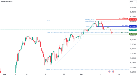 Based on the H4 chart analysis, we will wait for price to pullback to our sell entry at 6,072.05, a pullback resistance.Our take profit will be set at 6,031.03, a