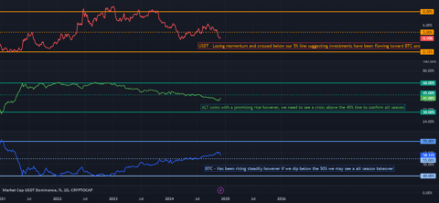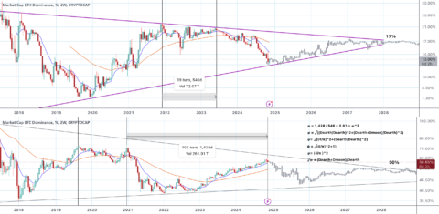 Recently in a previous post, I have suggested that the relationship CRYPTOCAP:ETH/BTC appears to be running on an 8 year cycle.Here on these graphs we can see the Dominance of