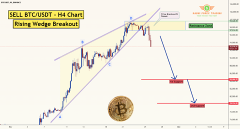 The BTC/USDT pair on the H4 timeframe presents a Potential Selling Opportunity due to a recent breakout from a Rising Wedge Pattern. This suggests a shift in momentum towards the
