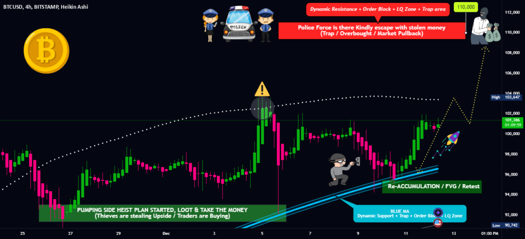Based on Thief Trading style technical analysis, here is our master plan to heist the BTC/USD “BITCOIN” cryptocurrency market. Please adhere to the strategy I’ve outlined in the chart, which emphasizes long entrance. Our aim is the high-risk Red Zone. Risky level, overbought market, consolidation, trend reversal, trap at the level where traders and bearish robbers are stronger. Be wealthy, cautious, and safe.