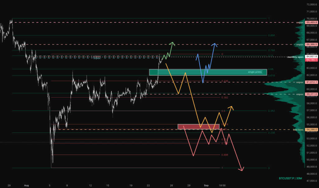 Blue: We broke through the golden pocket (gp), which means that if bulls can turn it into support, they have a good chance of breaking the fib high. There is a single print in this gp as well, giving a good opportunity for price to go back down there. Bulls want to see gp hold on a candle closing basis (this is of course subject to timeframe, so not really hard science)