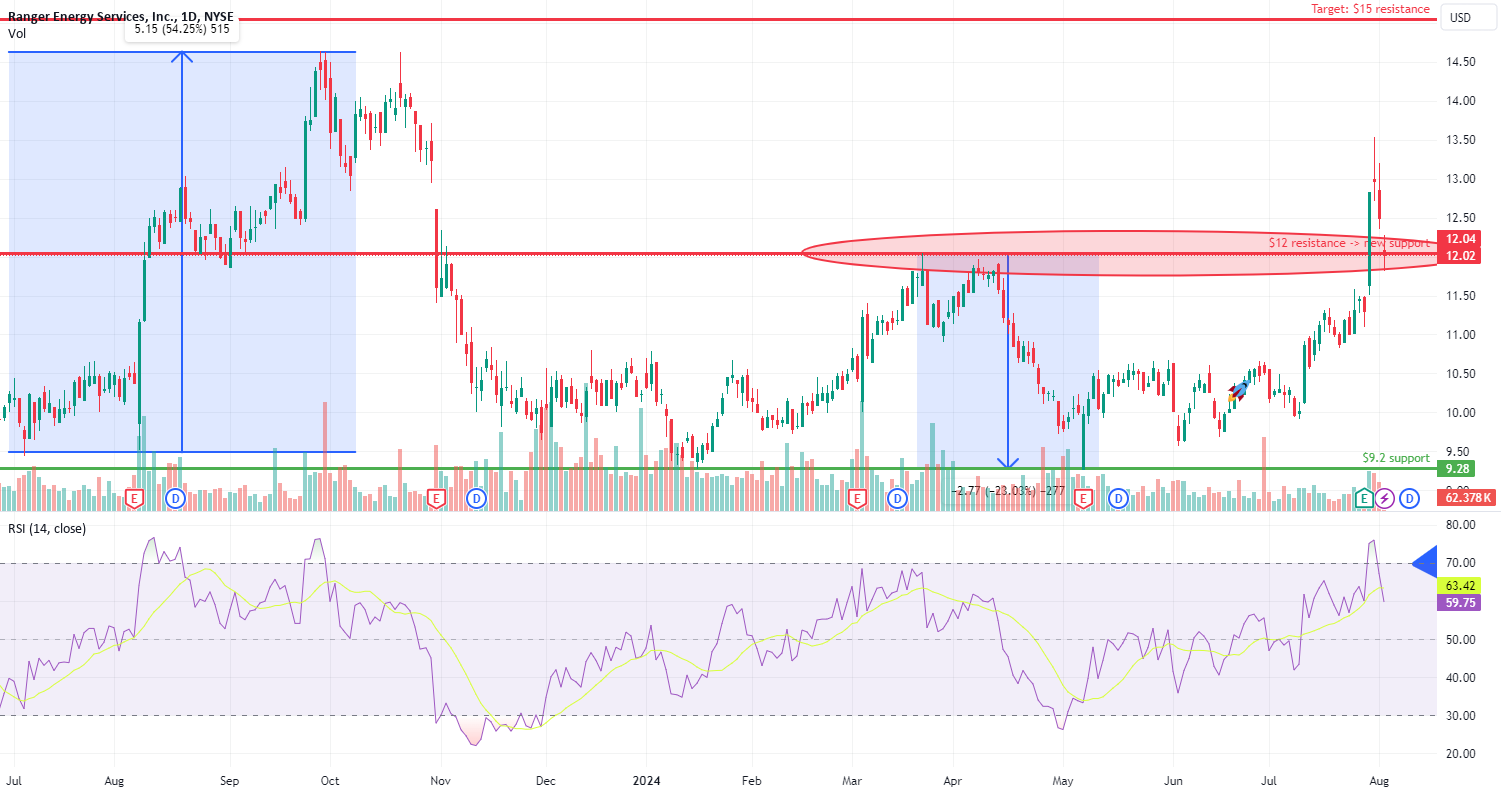 Ranger Energy Services, Inc. RNGR is on an 11% pullback to the $12 support following spectacular Q2 results, with a surprise in their EPS of 47%.This is one of my