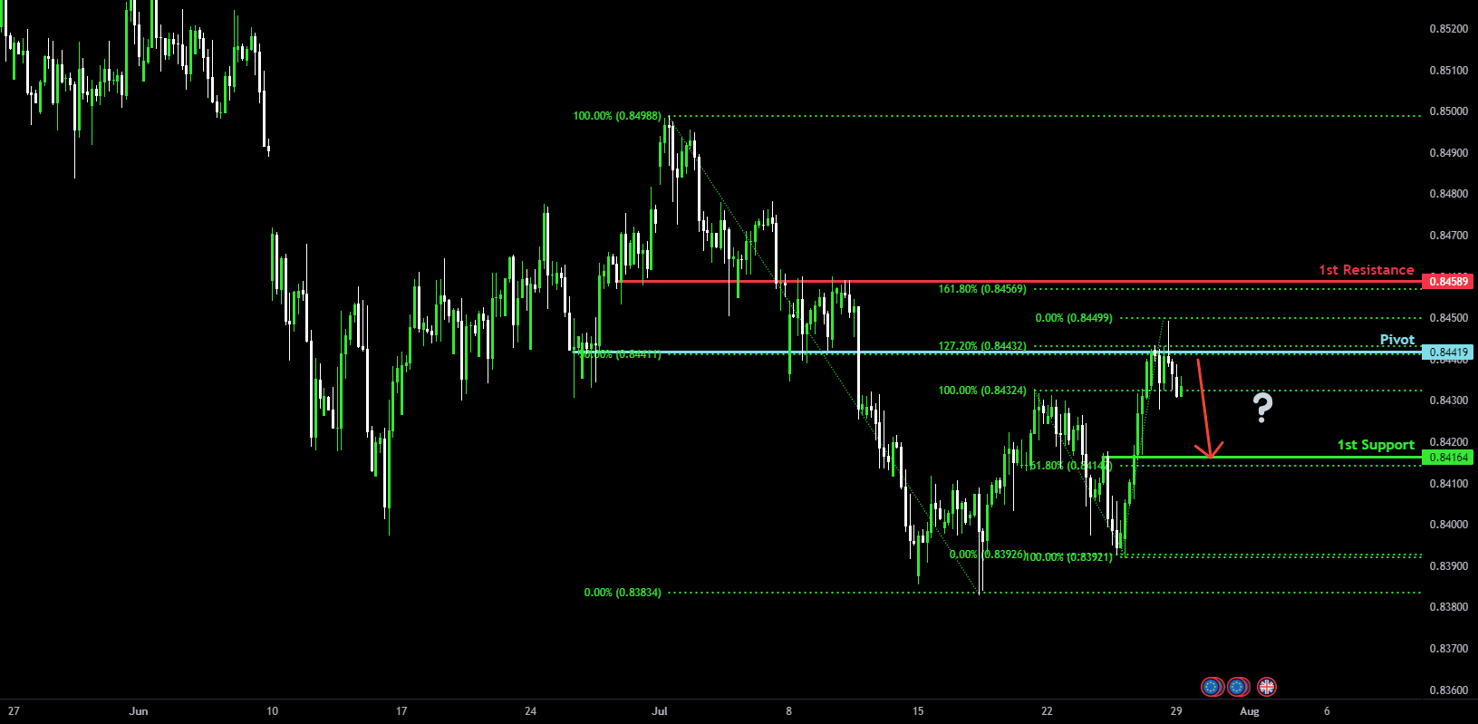 EUR/GBP has reacted off the pivot and could potentially drop to the 1st support which is a pullback support. Pivot: 0.84419 1st Support: 0.84164 1st Resistance: 0.84589 Risk Warning: Trading
