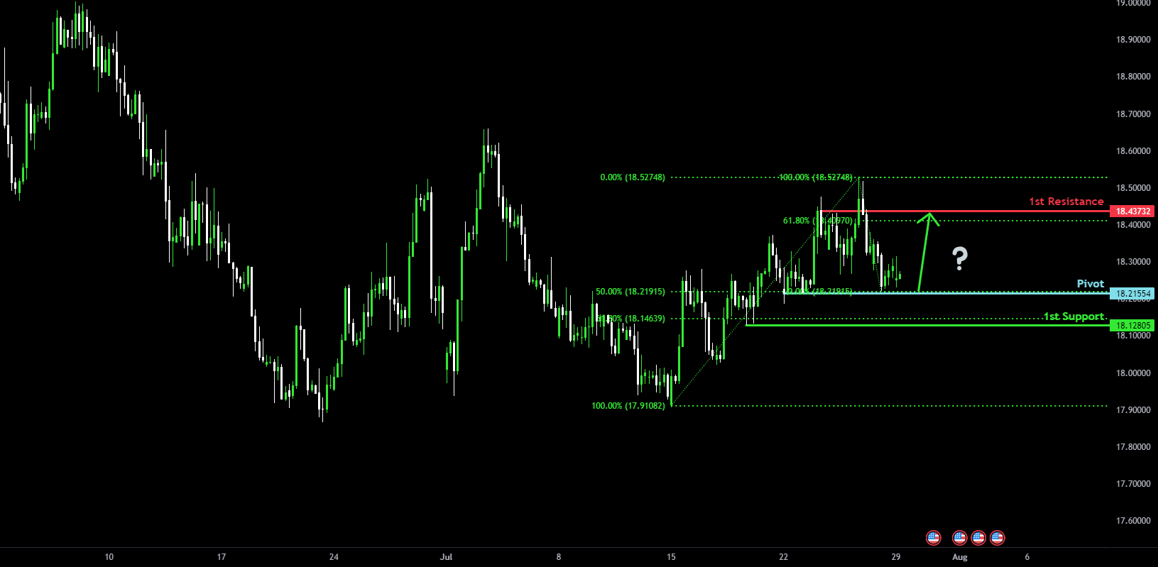 USD/ZAR has reacted off the pivot which has been identified as a pullback support and could potentially rise to the 1st resistance. Pivot: 18.2155 1st Support: 18.1280 1st Resistance: 18.4373