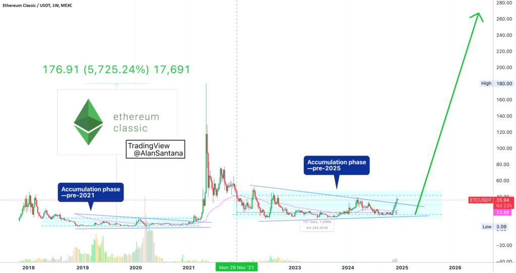 This is a chart, a pair, a project, that we visit often. It happens with some of the pairs. Some we just tend to gravitate towards them and continue to publish updates. Ethereum Classic looks great long-term.