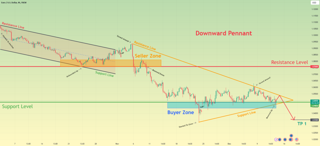 Hello traders, I want share with you my opinion about Euro. Observing the chart, we can see how the price declined inside the downward channel, where it fell to the seller zone, which coincided with the resistance level. Then price fell to this level and then rebounded and in a short time rose to 1.0935 points, exiting from the channel and making a first gap. Then Euro turned around and started to decline inside a downward pennant, where it soon broke the 1.0760 level and then tried to back up, but failed and continued to decline. In a short time, the Euro dropped to the 1.0485 level, which coincided with the buyer zone, broke it, and fell to the support line of the pennant. Then it turned around and quickly rose to the resistance line of the pennant pattern, making a second gap and breaking the 1.0485 level one more time. After this, the price turned around and fell from the resistance line to the support level, where it continues to trade very close to this day. In my mind, the Euro can rise to the resistance line of the pennant and then rebound down, thereby exiting from this pattern and breaking the support level. After this movement, I think that the price will continue to decline, so, I set my TP at 1.0350 points. Please share this idea with your friends and click Boost