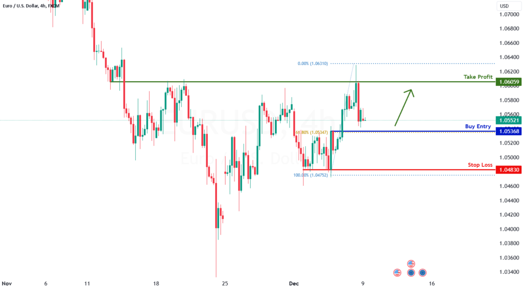Based on the H4 chart analysis, we can see that the price is falling to our buy entry at 1.0536, which is a pullback support that aligns with 61.8% Fibo retracement.