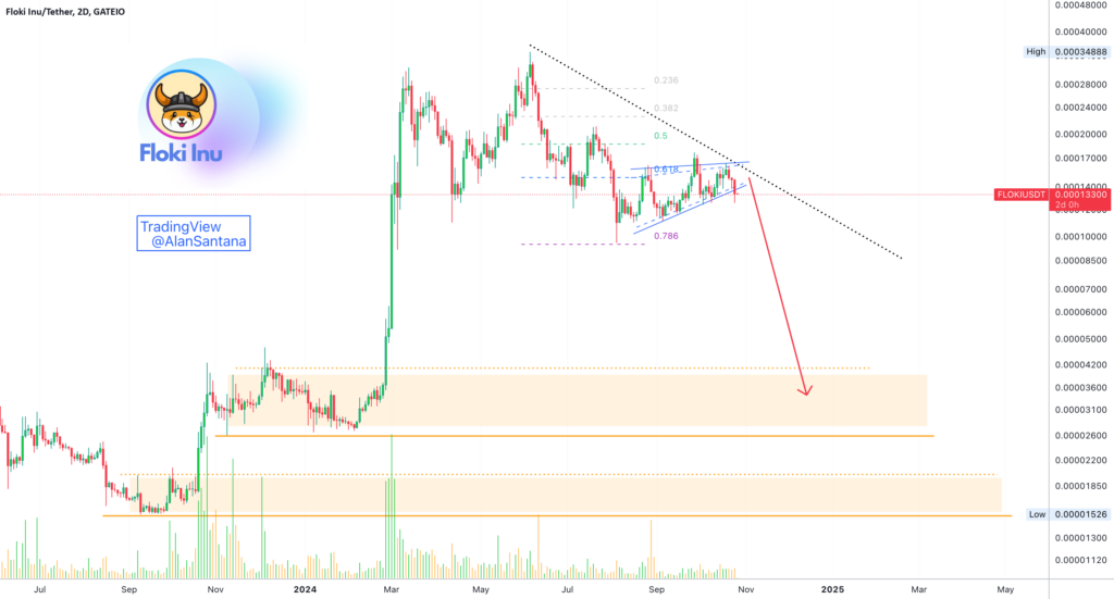Floki Inu (FLOKIUSDT) peaked in March 2024. It produced a higher high in June as part of an irregular correction, it has been moving down since.