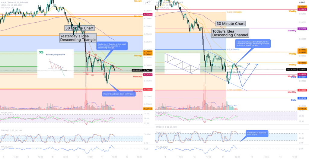 In yesterday’s idea, I suggested that GALA’s correction was forming a descending triangle, a bearish continuation pattern as illustrated above. However, with more price action now available, it appears the correction is more accurately forming a descending channel, which has a bullish bias. The key takeaway? Corrections are dynamic—it’s crucial to forecast but stay flexible and adapt as new data emerges.
