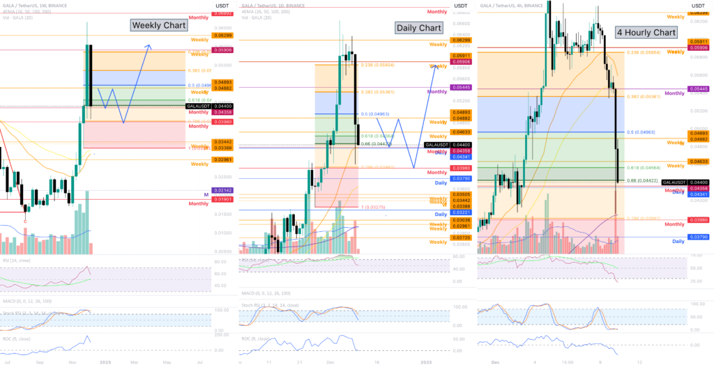 Yesterday, I exited my GALA position based on confirmation from the 4-hour timeframe. Although I considered waiting for a daily close to validate the bearish trend, the strong downward signals on the smaller timeframe prompted me to act earlier. This decision proved advantageous, as we experienced a significant price drop.