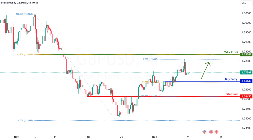 Based on the H4 chart analysis, we can see that the price is falling to our buy entry at 1.2694, which is an overlap support that aligns with 61.8% Fibo retracement.