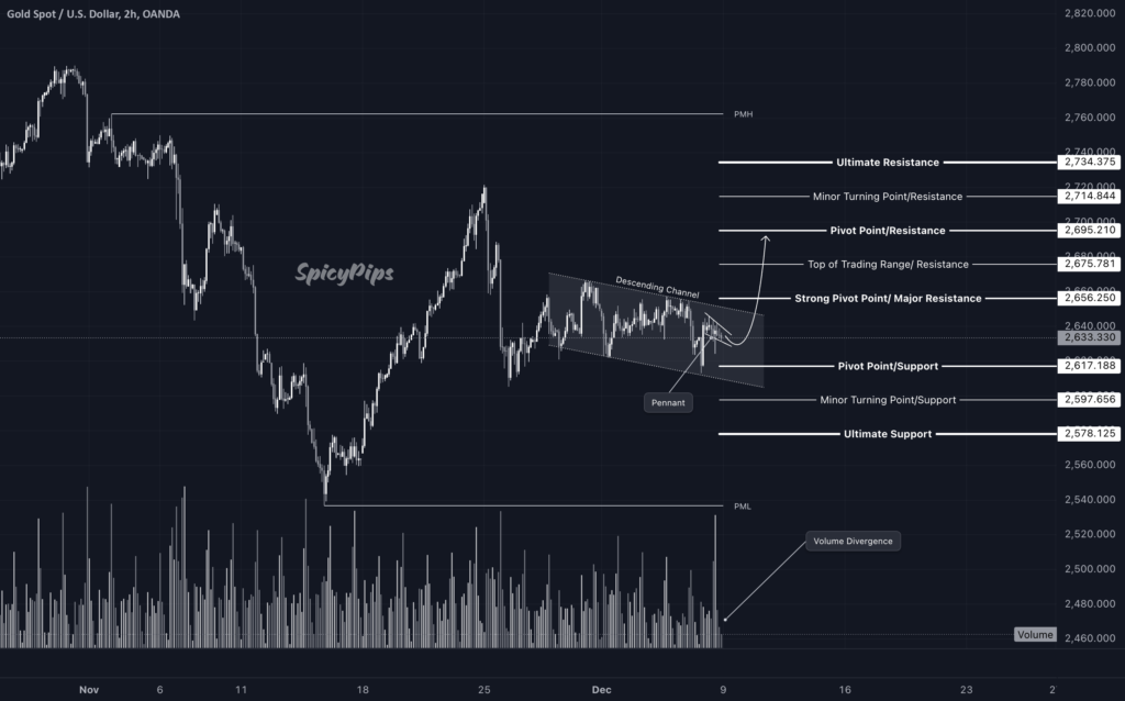 The chart analysis shows that the yellow metal has formed a descending channel starting on November 28. The price closed within a Pennant, marked by a 2-hour bearish candle, likely influenced by the weekend pause. Volume divergence is also evident.