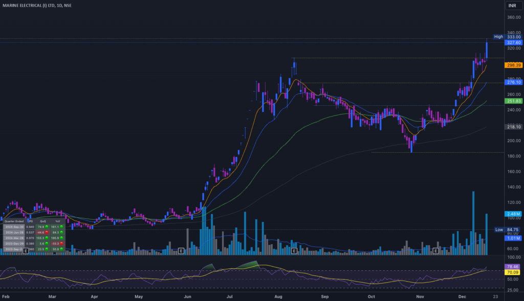 • The breakout above ₹298 with strong volume and upward sloping EMAs supports bullish continuation.