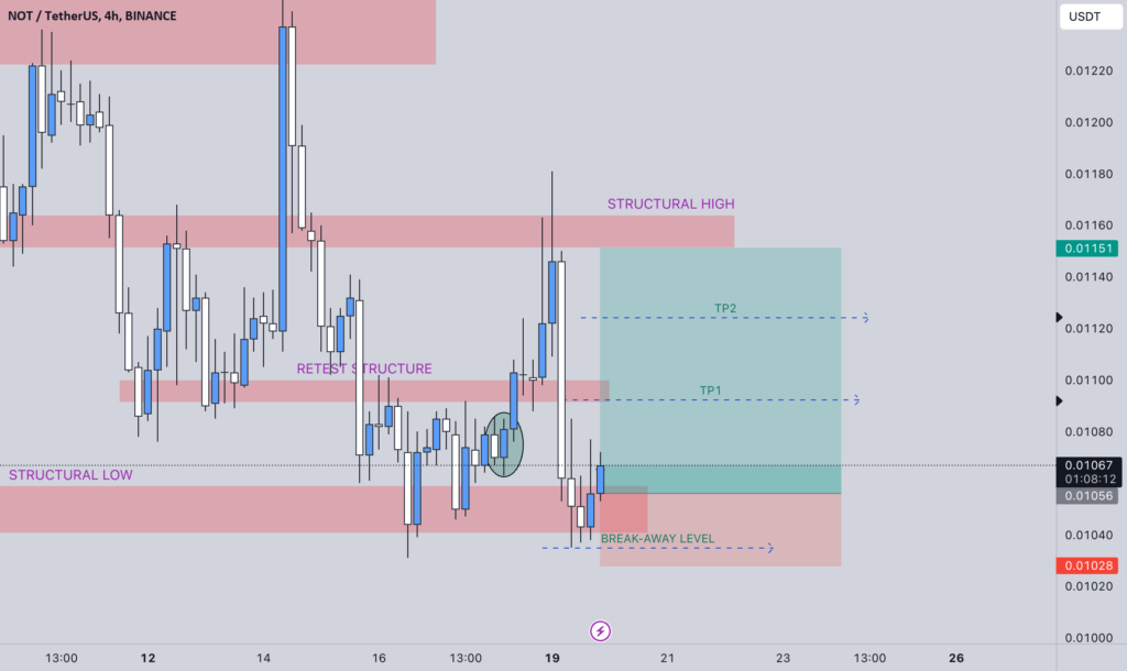 NOTUSDT is currently in a strong uptrend, with the $0.01152 level in sight. The formation of the Luftwing Candle on the 4H chart reinforces the buy bias, suggesting that the bulls are in control and pushing the market higher. Traders should monitor the price action around the $0.01152 resistance level for potential breakout opportunities or look for support at $0.01120 in case of any retracement.