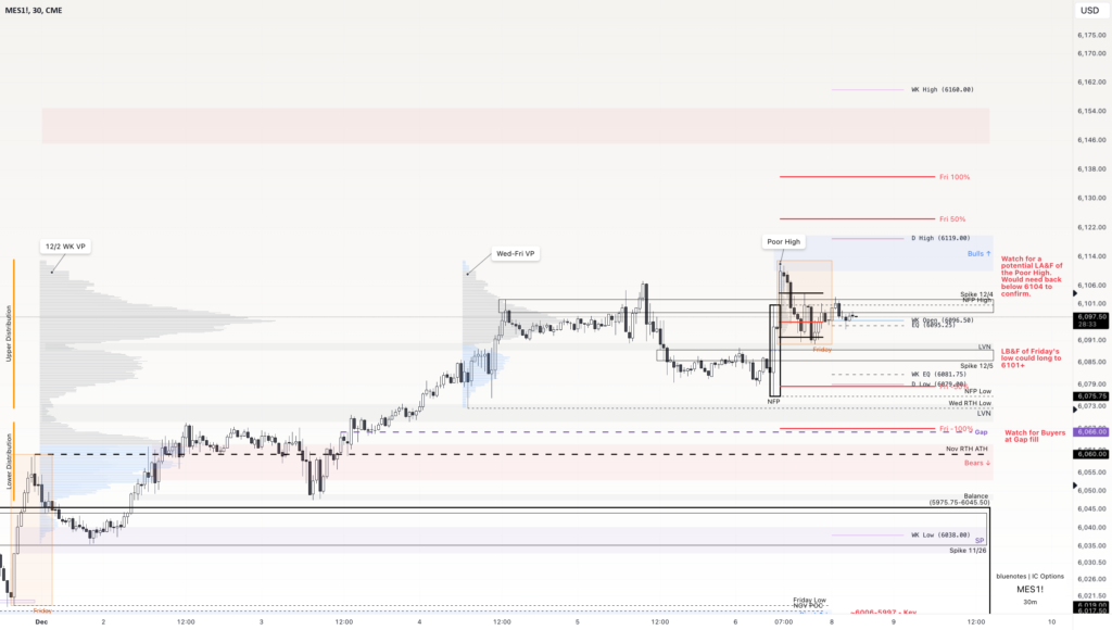 For longs, I would be interested in a look below and fail of 6092-88. There is a LVN between Friday’s low and the 12/5 Spike base. Take this up to 6100-06, trim and see where we go from there. A break above Friday’s VAH, 6104 would target Friday’s Poor High. Afterwards, we observe for the look above and fail possibility. Otherwise, trail the long. Above then targets 6124 and 6136, Friday 50% and 100% extensions respectively.
