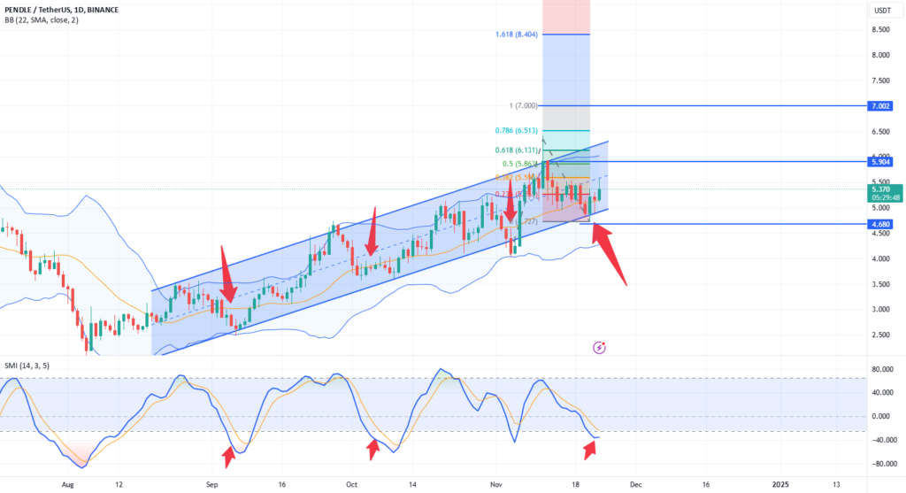 PENDLEUSDT is currently in an ascending channel on the daily chart and is at its support level. I’ve also marked (red arrows) previous instances where the stochastic was oversold while Pendle was at the channel’s support. This is a trade I would consider taking now, with a stop loss slightly below $4.78.