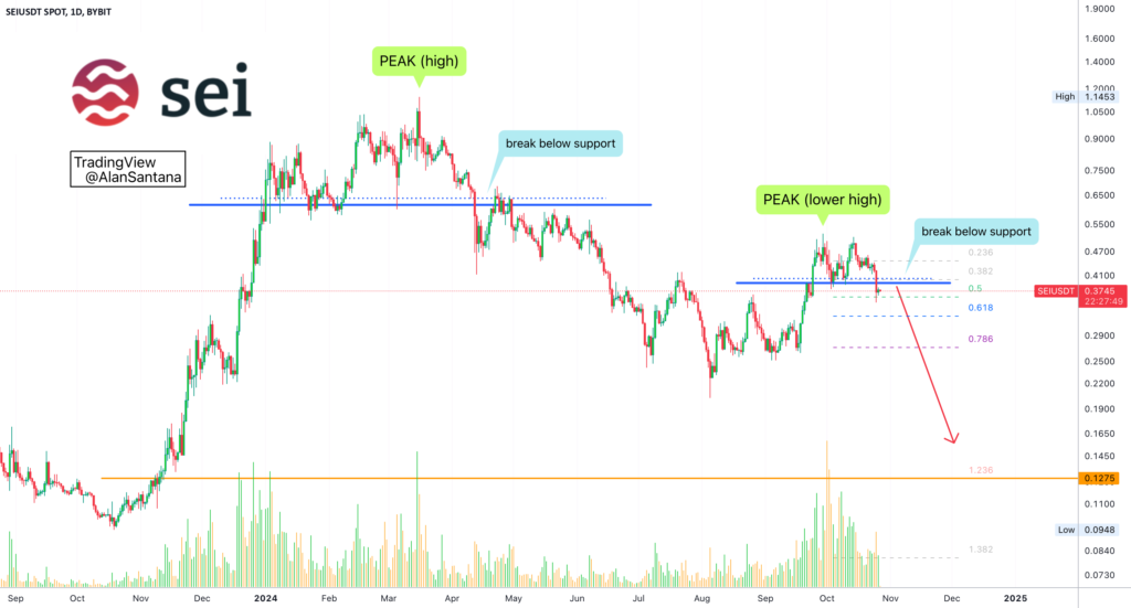 SEIUSDT first peaked in March and as soon as it moved below support, a drop was confirmed. This drop led to SEIUSDT reaching the lowest prices since November 2023.