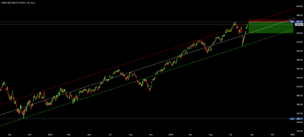 (SPY) S&P 500 index rapidly dropped in a week, then bounced in a V shape recovery for 2 weeks, now it could u-turn back down. SPY is back at it’s resistance level of it’s 2 year trend channel. There’s not much upside left this week from the 560 area. However, it could temporarily false breakout. I’m posting this as a short because there’s way more downside than upside potential for the next month. Since there has been steady momentum going up from Monday 8/5 bounce off 510 low, this short setup will probably take a few days. It’s likely a catalyst related to newsworthy current events (Macroeconomic / Geopolitical) will u-turn the momentum around.