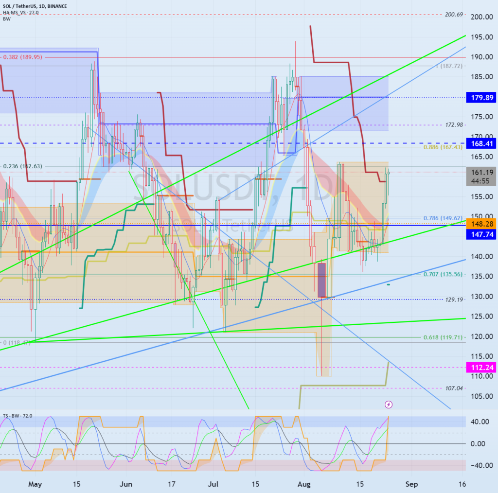If you look at the 1M, 1W, and 1D charts above, you can see that the 147.74, 168.41, and 179.89 points are important.