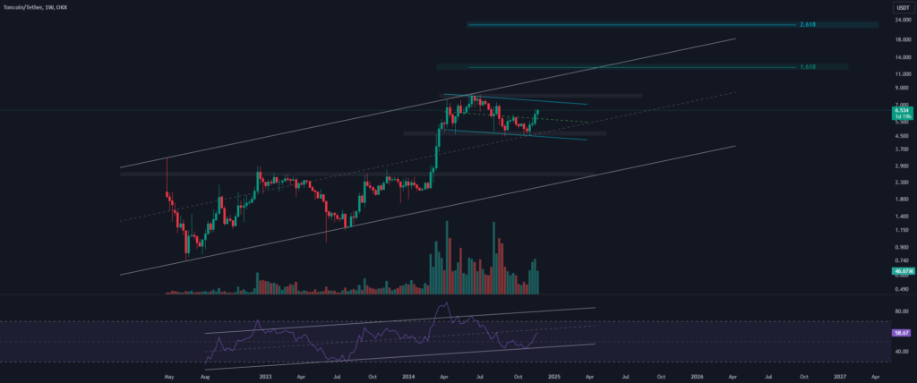 Toncoin remains within a large ascending channel, and the current movement in the short-term descending channel is seen as a consolidation phase.