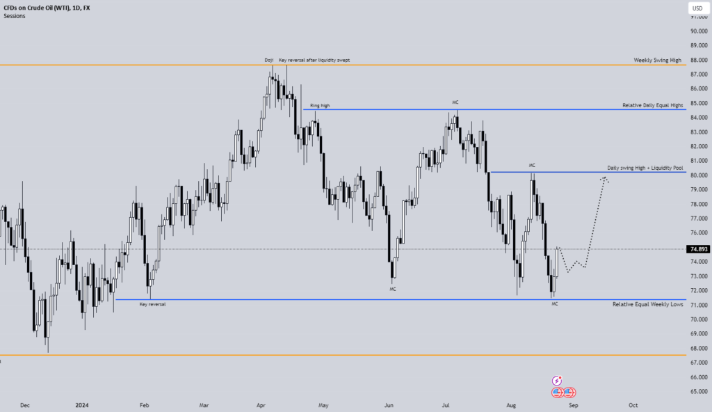 Last week USOil price closed after forming a bearish candle, however, it tested and swept liquidity below the August 5th weekly candle before changing the structure from bearish to bullish. Note that USOil price has been moving within a range from 80 to 72 levels since 22 July 2024.