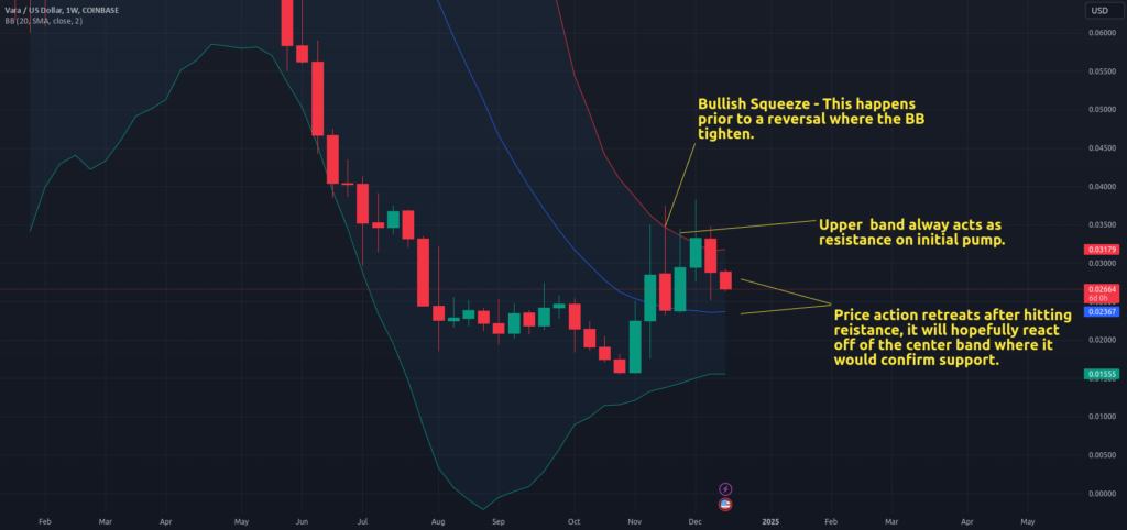 As you can clearly see the B Bands have tightened. Price action has already hit the upper band resistance as it is supposed to and support of the center band was previously confirmed. Price action is headed toward the center B Bands where it will likely confirm support again and break out. This sums up the accumulation phase on the weekly chart. Sorry to those of you who are staring at the 4 hour, that cannot be done on assets like this. We are only concerned with the big picture which is that this Asset pumped all the way up to the top of the B Bands and retreated. This is unavoidable even for Bitcoin. Understandably VARA is going to pull back more and more often, this is why swing trading the asset is such a joy. All I can tell you is small moves on the lower time frames are technical pointers but are in no way the direction of this coin. I mentioned previously that this weeks candle would likely be red and when I said that it did not mean the price is going up, it means exactly what it says, a downward move.