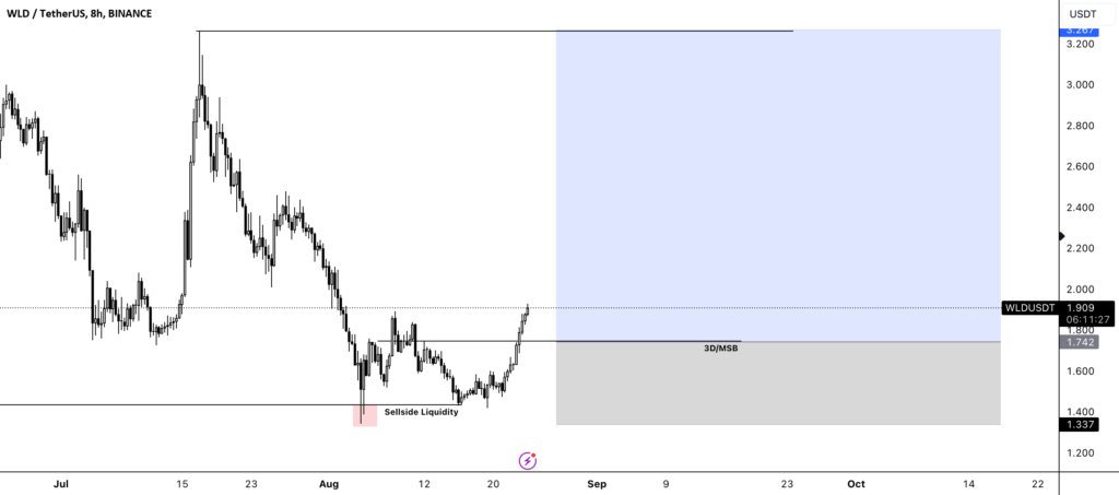 The market recently captured sellside liquidity around 1.337 USDT, indicating that weak hands might have been cleared out, suggesting a potential bullish move. The price also broke through the 3D/MSB level at 1.742 USDT, further supporting the bullish bias.