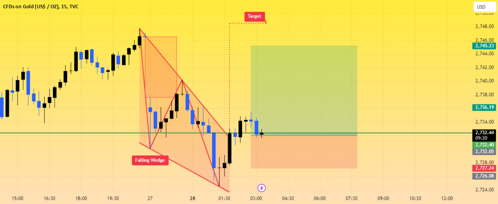 Set your stop loss at 2,726.30 below the previous low ($6.00 loss for 0.01 lot) and take profit at 2,745.30 ($7.00 profit for 0.01 lot).