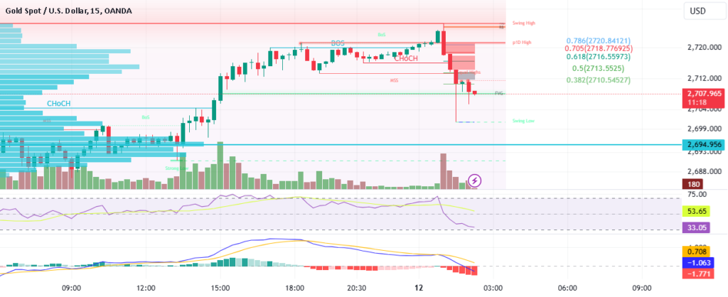 Entry Point: Near the Swing High (2,720.84121 USD) or the upper Fibonacci retracement levels (0.786 or 0.705).