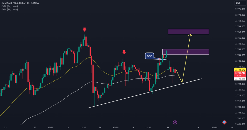Outlook for XAUUSD: On the 1-hour chart, as Ben mentioned earlier, XAUUSD currently has strong support around the 2725 level. A break below this level could lead to a significant price drop, while maintaining it would support further gains. Upon close observation, it’s evident that the pair is gaining upward momentum from the trendline, and a recently opened gap has bolstered buying sentiment. If the upward momentum continues, the next resistance targets for XAUUSD are 2747 and 2758.