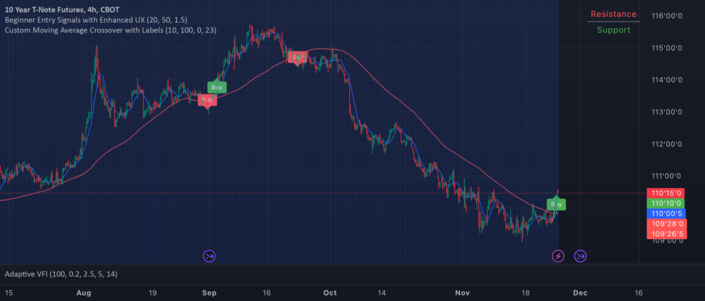 Struggling to spot precise trade opportunities? Here’s a game-changing approach! The 10-Year T-Note Futures chart shows a strong reversal pattern, enhanced by our Beginner Entry Signals. The clear “Buy” signal aligns with an Adaptive Volume Flow Indicator (AVFI), signaling a potential upward trend.